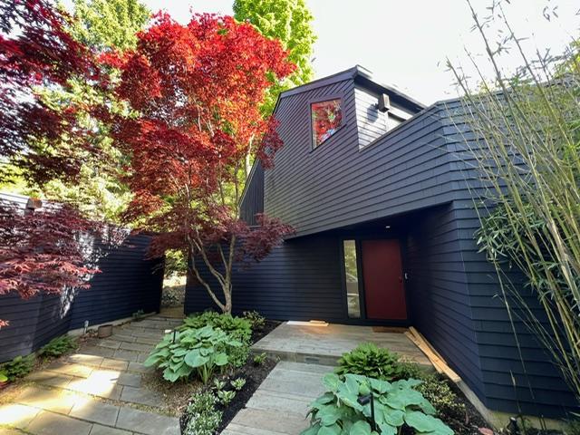 Modern house with dark, angular siding, surrounded by lush greenery. A vibrant red tree stands in the foreground on a stone pathway, creating a serene, contemporary vibe.
